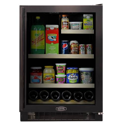 Keep food and drinks cold and wherever you want them with the Marvel 24-Inch Refrigerator with Black Cabinet and Black Trim Glass Door (6GARM-BB-G-R, 6GARM-BB-G-L). This versatile refrigerator is capable of being installed as a built-in unit or can simply stand on its own. Regardless of the installation method that you choose, know that it will look great with a sleek black cabinet and door frame, and tinted, dual-pane UV resistant glass door. The cantilever style shelving system is adjustable to fit your needs with three (3) glass, maple-front shelves - two (2) full-width and one (1) half-width. The half-width shelf allows you to vertically store taller items such as juice bottles and milk jugs. Equipped with Marvel's advanced MicroSentry⢠microprocessor-controlled refrigeration monitor, this model will always maintain the optimal temperature. Need it a little warmer or cooler at times? Simply use the amber LED temperature control to easily adjust the temperature within a 35 °F to 43 °F range. The Marvel 24-Inch Refrigerator with Black Cabinet and Black Trim Glass Door has a durable powder-coated door with a hinge that can be reversed from the factory so you can choose which way you would like it to open. Inside youâll find easy-to-clean molded surfaces all around, and a spacious 5.6 cubic feet of storage room. With a display lighting option, you can really show off the fridge itself or even what you keep inside. MicroSentry⢠Refrigeration Monitor: The advanced microprocessor-controlled system monitors the temperature in real-time to maintain the perfect temperature Advanced Cooling System: Efficient cooling is automatic with the employment of a forced air cooling system Close Door Assist: The special hinge system automatically draws the door closed when it is accidentally left ajar