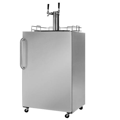 The Summit Professional Double Tap Beer Kegerator (SBC490OSTWIN) will allow you to throw the party you always dreamed of. This full-sized beer dispenser brings the pleasure of a cold draft to the outdoors. Fully equipped to stand up to the elements, the SBC490OSTWIN meets and exceeds U.L. requirements for safe outdoor operation. The exterior is completely wrapped in non-corrodible 304 grade stainless steel, with the back fully sealed to protect all electrical components. An integrated Ground Fault Circuit Interrupter (GFCI) prevents circuit breaks from damaging the unit or causing electric shocks. The Summit Dual Tap Kegerator includes all the tap accessories you need to serve beer from a half, quarter, or mini keg, as well as removable shelves that conveniently convert the beer cooler into a refrigerator. The dual tap system lets you serve two different beers to provide your guests with more variety. Automatic defrost saves time and maintenance and an adjustable thermostat lets you set the proper temperature for stored beer. Designed primarily for freestanding use, this undercounter beer dispenser can be installed as a built-in unit but requires 1 1/2 inch of space between the rear of the unit and wall and a 1/2 inch of space between the unit sides and cabinetry. Here's What's Included: Ships complete with all components needed to tap one keg: CO2 tank, regulator, beer line, air line, tap, tower, cleaning kit, faucet, and faucet handle (keg not included) Professional towel bar handle: A curved stainless steel handle provides generous room for a comfortable grip Convertible to a refrigerator: Transform the beer cooler into a standard refrigerator with adjustable shelves